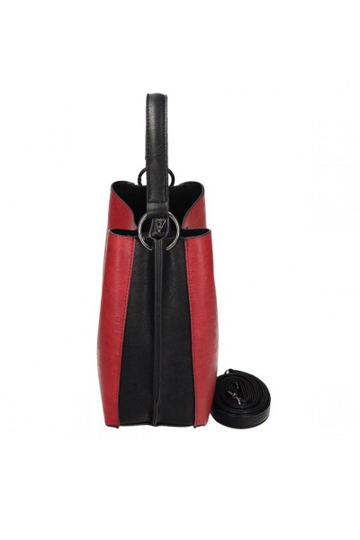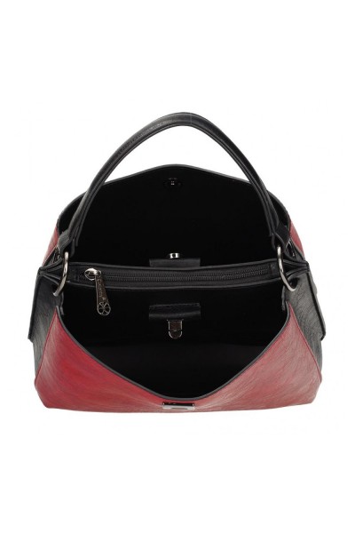 Két szín kombinálásával készült, pántos, csatos és húzózáras táska. A fekete szín jól kiemeli az elő és hátlapok elütő színét. Elegáns és mutatós darab, a mindennapok kedvence, amelyben bőven akad hely minden apróságnak.