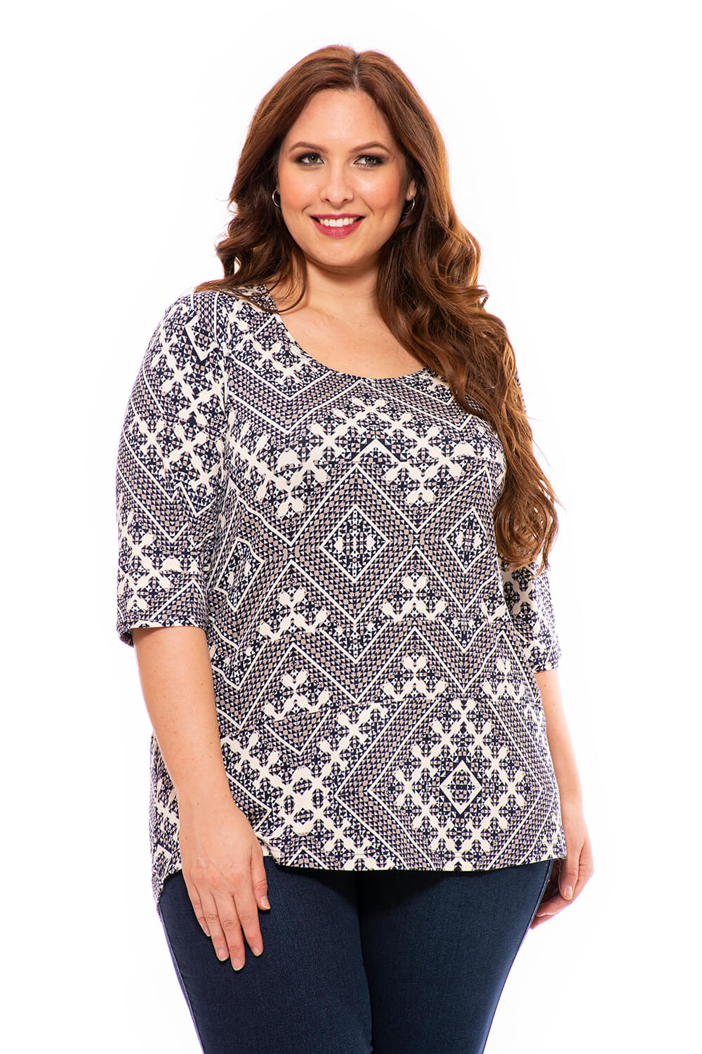 A biztos befutó! Viszkóz anyagú, kellemes viseletű, lefelé “A” vonalba bővülő tunika. 3/4-es ujja hosszal, szép kerek kivágással, amelyet strassz kövek emelnek ki. Őszies, sötétkék és bézs színű mintájával, karcsúsítja az alakot és akár farmerhoz is jól mutat. Nagy méretben is, jó áron.